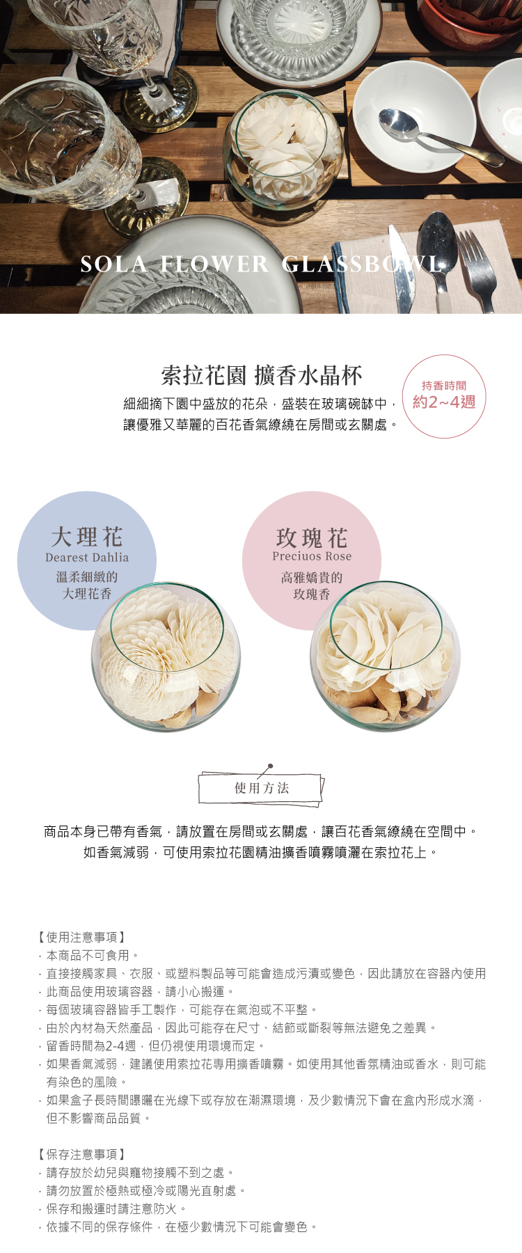 細細摘下園中盛放的花朵,盛裝在玻璃碗缽中 搭配使用精油香霧噴灑在索拉花上,讓優雅又華麗的百花香氣繚繞在房間或玄關處